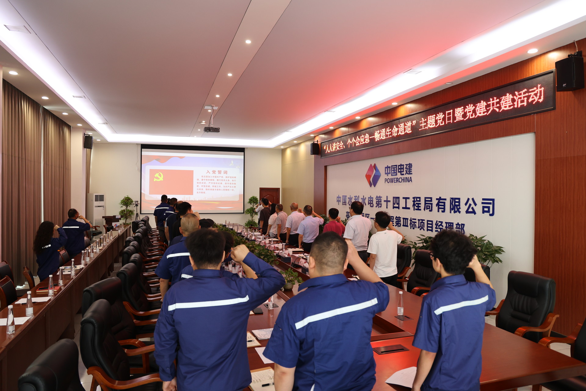 活動伊始,黨支部書記帶領全體黨員面對黨旗重溫了入黨誓詞。隨后,全員深入學習領會《習近平總書記關于應急管理的安全生產重要論述和重要指示批示精神》的摘編;Ⅲ標聯合體安全總監帶領學習解讀了新《安全生產法》;全體干部職工認真觀看了“安全生產月”主題宣傳片、《安全生產責任在肩》警示教育片。