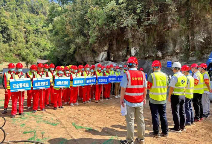 此次演練主要有演練動員、現場演練、演練總結三個環節,包含了應急預案啟動、人員疏散、機械撤離、隧洞洞口封堵等四個場景。