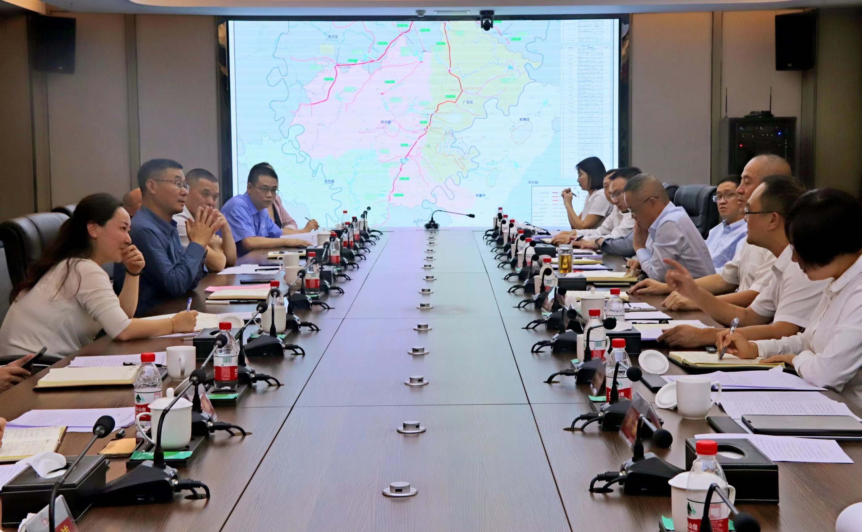 在洽談會上,文祥明介紹了亭子口公司及灌區工程基本情況、供水優勢條件、前期雙方對接成果以及下步合作期待。他表示,亭子口灌區工程是四川省骨干水網建設的重要組成部分,是川東北地區灌溉面積最大、供水人口最多、保障范圍最廣的重大水利支撐項目。為灌區供好水是公司重要的使命和責任,將在水利廳、水發集團堅強領導和大力支持下,充分發揮優勢,與廣安愛眾資源共享。在遵循“依法合規、互利共贏、各展所長、鏈條互補、長期合作、共謀發展”的原則下推進務實合作,拓展雙方在全域城鄉供水、水資源開發、水環境治理、涉水文旅開發等方面深度合作。愛眾股份副總經理劉經文介紹了公司基本情況及廣安、岳池、武勝子公司供水情況。洽談中,雙方相關部門就供水方案具體細節進行了充分探討和交流。