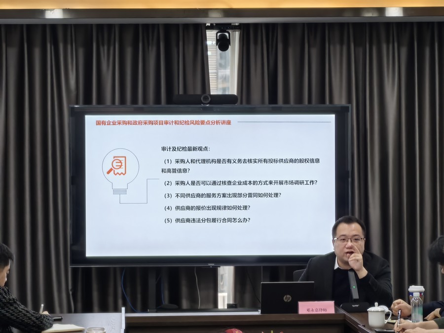 為提升投資公司及下屬企業(yè)的法律合規(guī)意識,降低日常工作中法律合規(guī)風險,為公司經(jīng)營發(fā)展保駕護航,11月30日,投資公司邀請法律顧問開展“國有企業(yè)采購工作常見法律風險分析及案例講解”法律講座。