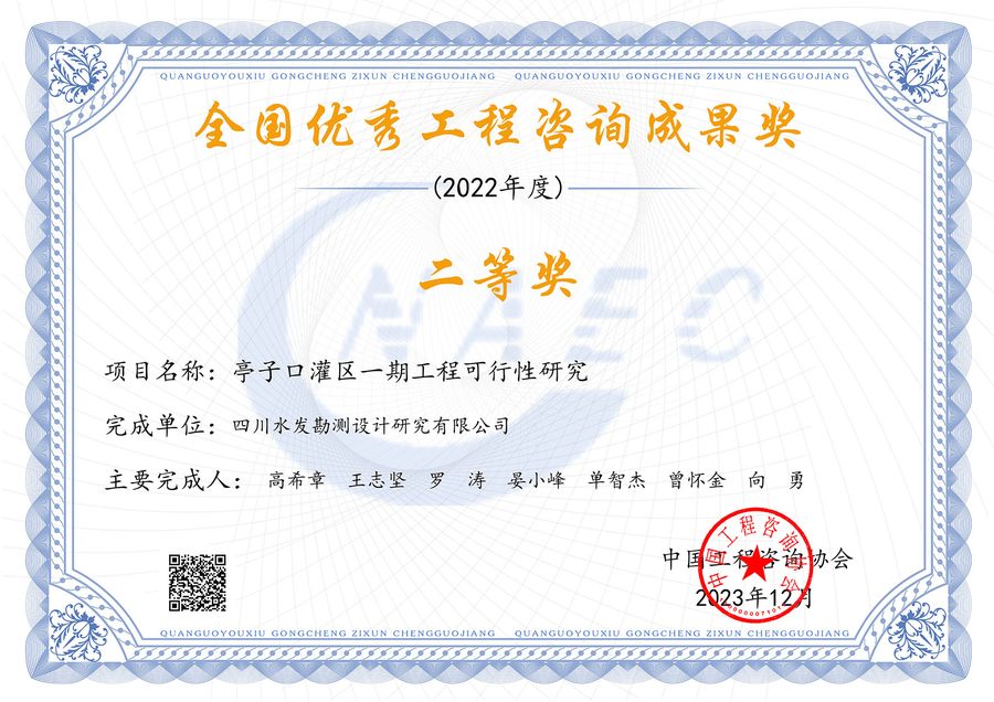 2023年12月29日,在中國工程咨詢協會發布的《中國工程咨詢協會關于公布2022年度全國優秀工程咨詢成果獎獲獎項目名單的通知》(中咨協政研(2023)112號)中,四川水發設計公司完成的《亭子口灌區一期可行性研究》榮獲全國優秀工程咨詢成果二等獎。