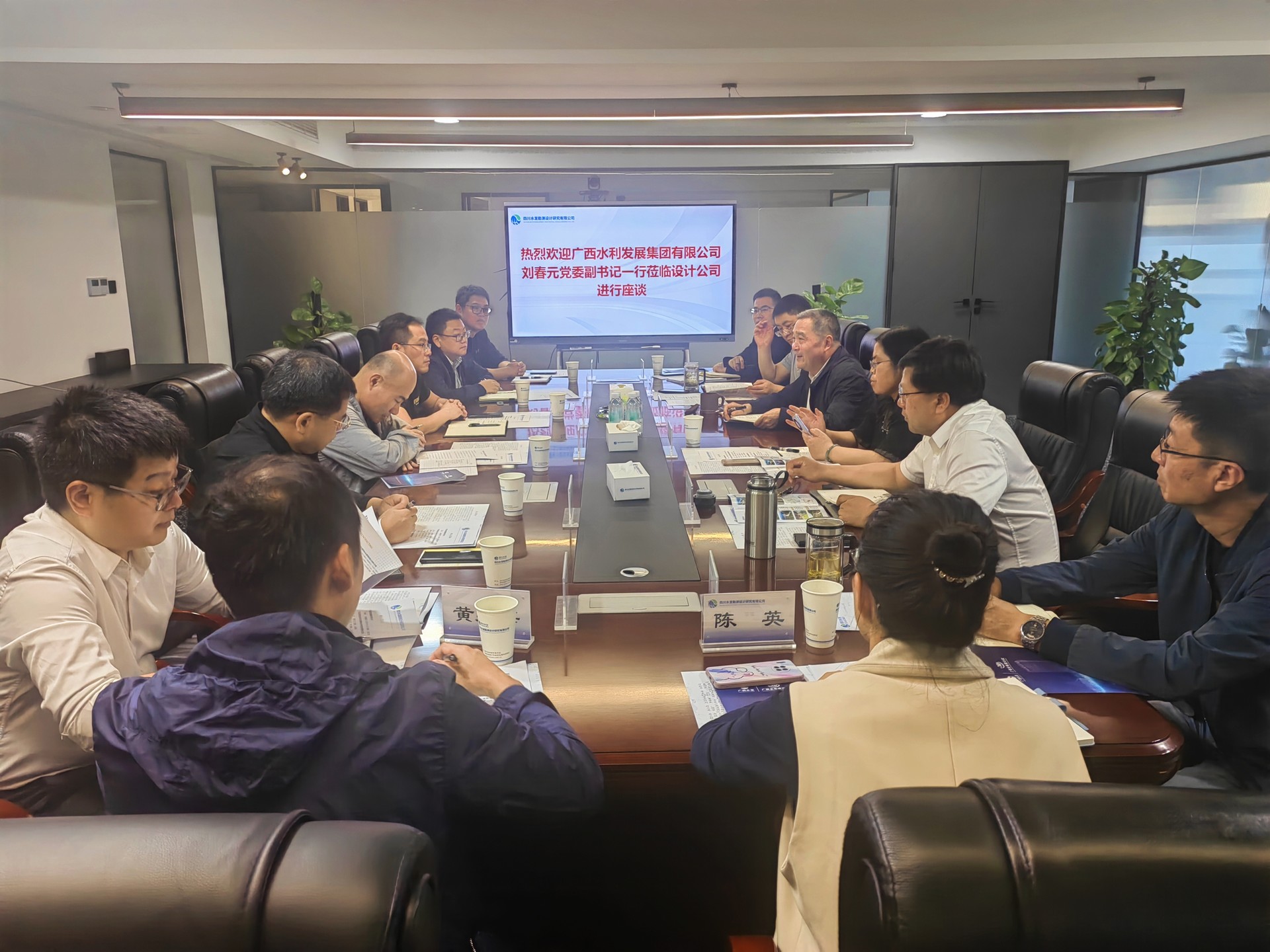 近日,廣西水利發展集團有限公司黨委副書記、紀委書記、職工董事、工會主席劉春元一行蒞臨設計公司交流座談,廣西壯族自治區水利電力勘測設計研究院有限責任公司黨委書記、董事長、總經理唐崗,黨委副書記、職工董事、工會主席歐輝明以及有關部門、分院負責人陪同參加。