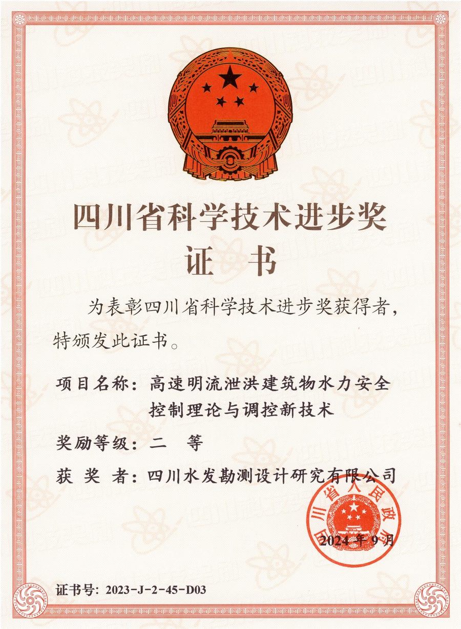 9月10日,四川省科學技術獎勵大會在成都舉行,會上宣讀了省政府《關于2023年度四川省科學技術獎勵的決定》。四川水發設計公司參與完成的“高速明流泄洪建筑物水力安全·控制理論與調控新技術”榮獲四川省科學技術進步二等獎。該項目的研究成果應用于紫坪鋪水利樞紐、鍋浪蹺水電站等25項水利水電工程,取得了顯著的經濟、社會和生態環境效益。