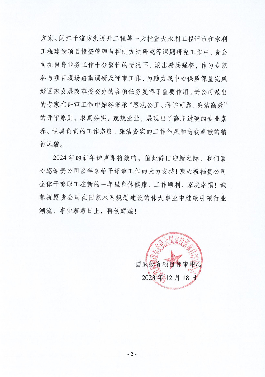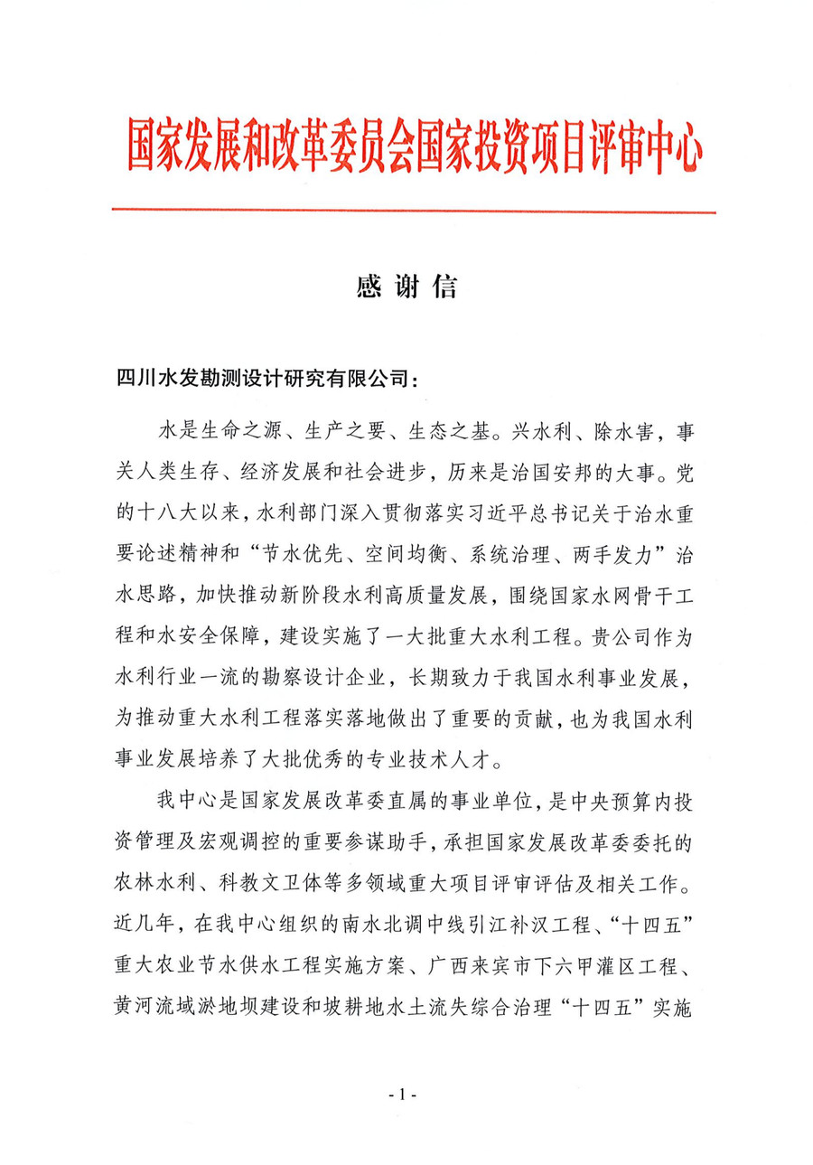 近日,國家發展改革委國家投資項目評審中心向四川水發設計公司發來感謝信。感謝信指出:近幾年,該公司在自身業務工作十分繁忙的情況下,派出精兵強將積極參與國家投資項目評審中心組織的一大批重大水利工程評審工作,在助力中心保質保量完成好國家發展改革委交辦的各項任務發揮了重要作用。