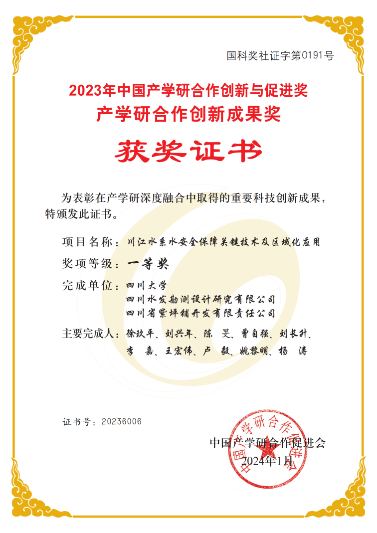 近日,由中國產(chǎn)學研合作促進會主辦的第十五屆中國產(chǎn)學研合作創(chuàng)新大會在北京隆重舉行。會議對2023年在產(chǎn)學研深度融合等方面作出貢獻的先進單位和個人進行了頒獎表彰,由四川水發(fā)設(shè)計公司聯(lián)合四川大學、四川省紫坪鋪開發(fā)有限責任公司完成的項目“川江水系水安全保障關(guān)鍵技術(shù)及區(qū)域化應(yīng)用”榮獲2023年產(chǎn)學研合作創(chuàng)新成果一等獎。這是該公司首次斬獲該榮譽,也是其大力發(fā)展科技創(chuàng)新的重要成果,彰顯了集團在水安全保障領(lǐng)域開展高質(zhì)量產(chǎn)學研創(chuàng)新協(xié)同的創(chuàng)新成果。