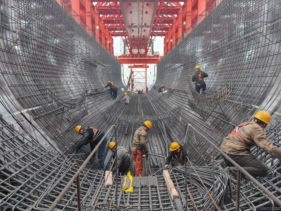 金雞梁隧洞內,工人正在焊接二襯仰拱鋼筋接頭